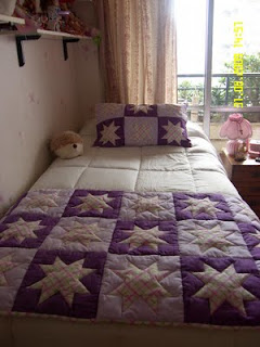 En un comienzo pretendía hacer un cubrecamas, pero a mitad de camino me di cuenta que necesitaba mas género y aunque busqué por todo Stgo. ya no había, así que obligada a dejarlo como piecera y comprar un plumón blanco pora que combinara, como me sobraron algunos bloques, aprovecehé de hacer la almohada. Debo decir que es bastante el trabajo, y más aún el final, ya que el borde lo hice a mano con puntada ciega.